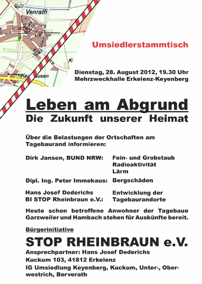 Informationsveranstaltung im Pfarrsaal Kuckum zur anstehenden Umsiedlung der Dörfer Keyenberg, Oberwestrich, Unterwestrich, Berverath und Kuckum .* Die v. g. Veranstaltung hat als eine nicht öffentliche Informationsveranstaltung zur anstehenden Umsiedlung unserer Heimatdörfer stattgefunden. |