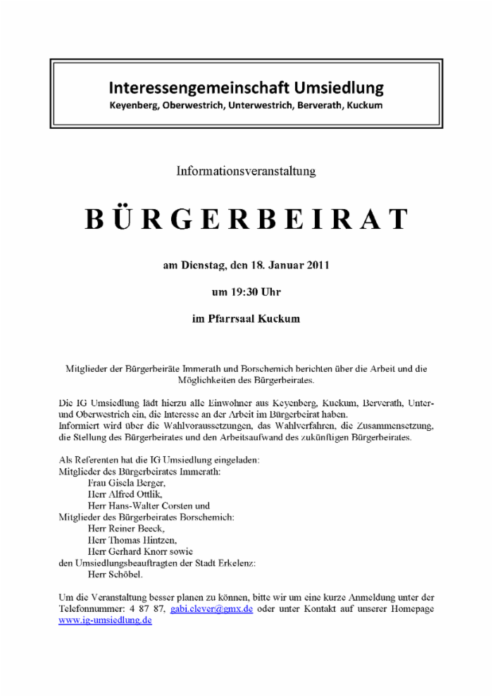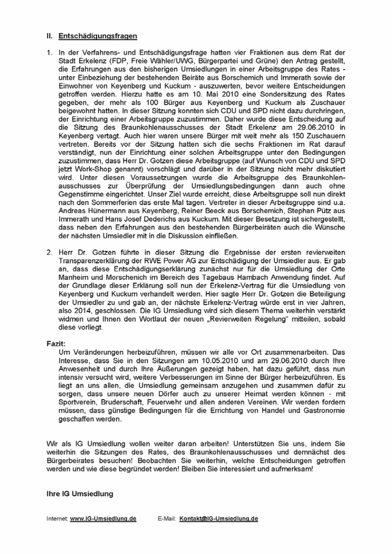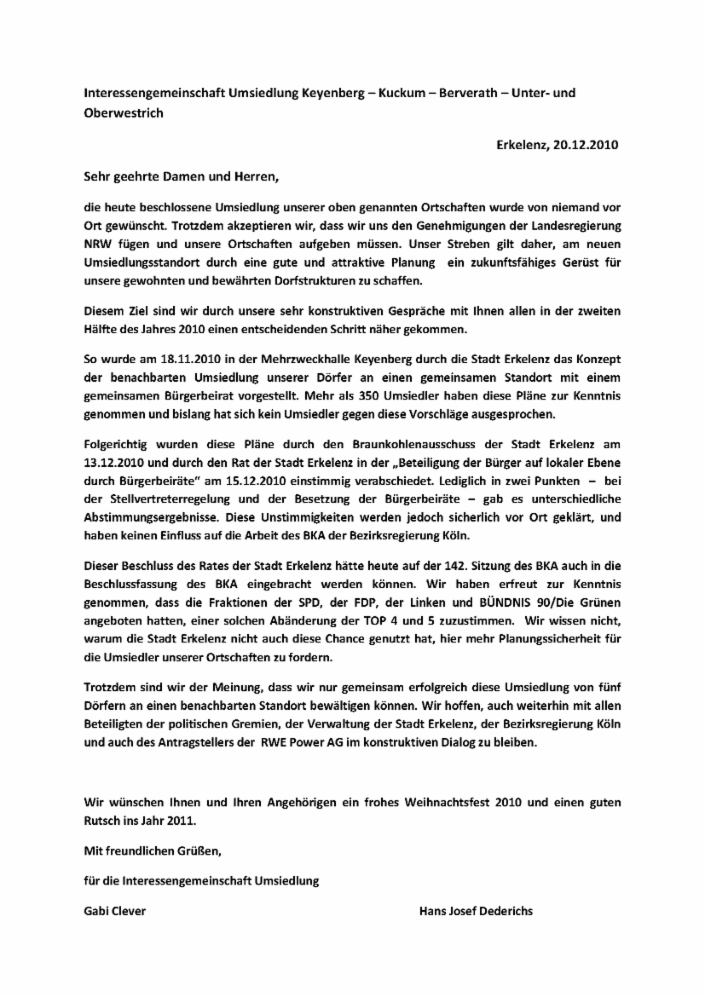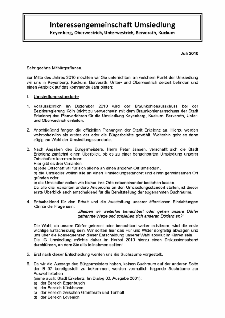 Interessengemeinschaft Umsiedlung Keyenberg, Oberwestrich, Unterwestrich, Berverath, Kuckum Kuckum/Keyenberg, im November 2009 An die Vorstandsvorsitzenden der Ortsvereine und die Kirchenvertreter Sehr geehrte Damen und Herren, im Laufe des Jahres 2009 haben wir Sie zweimal zu Versammlungen eingeladen, um mit Ihnen das Weiterbestehen unserer Vereine während und nach der Umsiedlung zu diskutieren. Im Rahmen dieser Veranstaltungen wurde deutlich, dass es für die Vereine lebensnotwendig ist, sich für die Zeit während der Umsiedlung aber auch nach der erfolgten Umsiedlung, neu aufzustellen. Die Chancen und Möglichkeiten einer getrennten oder weiterhin benachbarten Standortfindung sollten im Vorfeld einer möglichen Abstimmung bzw. Meinungsbildung der Stadt Erkelenz sachlich in den Vereinen und in der Öffentlichkeit diskutiert werden. Die vorgeschlagenen Standorte werden sich an dem Flächenbedarf der umzusiedelnden Orte orientieren. Daher ist die erste Entscheidung die wir treffen werden, die Entscheidung über eine getrennte oder benachbarte Zukunft unserer Ortschaften. Die Mitglieder der IG Umsiedlung bitten daher alle Vereine, das Thema der Umsiedlung und der Standortfindung in ihren anstehenden Mitglieder- oder Jahreshauptversammlungen auf die Tagesordnung zu setzen. Wenn Sie es möchten sind Mitglieder der IG Umsiedlung gerne bereit, auf ihrer Versammlung zu diesem Thema Auskunft zu geben. Mit freundlichen Grüßen Ihre IG Umsiedlung